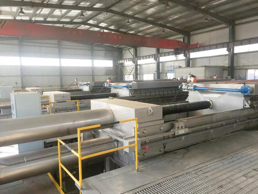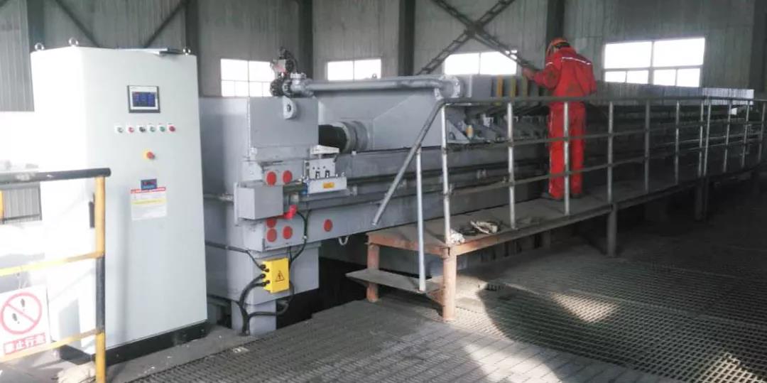 采用太阳成tyc33455ccwww2000型700平方单室进料压滤机 3台,每个循环50分钟,滤饼水份15-16%。