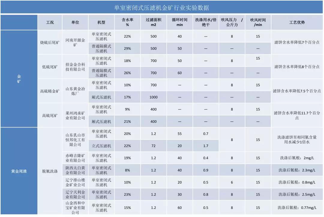 单室进料压滤机金矿行业实验数据